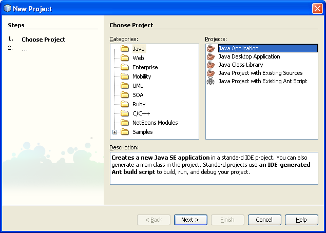 In the Categories pane, select the Java node and in the Projects pane, choose Java Application. Click Next.