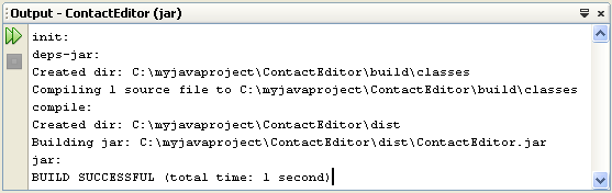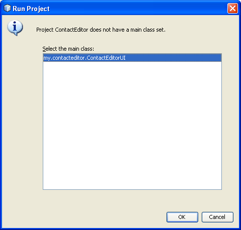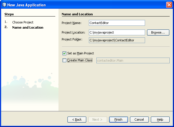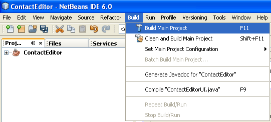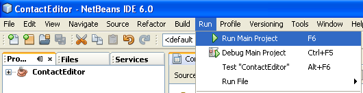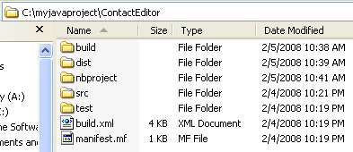 Because all Java development in the IDE takes place within projects, we first need to create a new ContactEditor project within which to store sources and other project files. An IDE project is a group of Java source files plus its associated meta data, including project-specific properties files, an Ant build script that controls the build and run settings, and a project.xml file that maps Ant targets to IDE commands. While Java applications often consist of several IDE projects, for the purposes of this tutorial, we will build a simple application which is stored entirely in a single project.