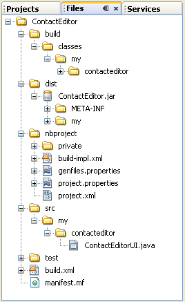 The IDE creates the ContactEditor folder on your system in the designated location. This folder contains all of the project's associated files, including its Ant script, folders for storing sources and tests, and a folder for project-specific metadata. To view the project structure, use the IDE's Files window as shown below (Some files and folders are available after the project has been built).