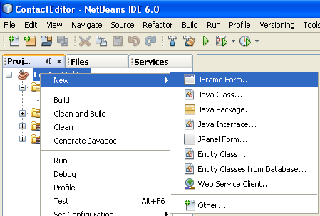 In the Projects window, right-click the ContactEditor node and choose New > JFrame Form.