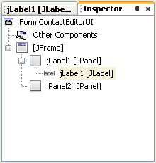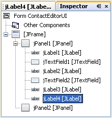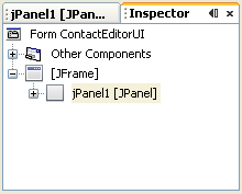 The JPanel component appears in the ContactEditorUI form with orange highlighting signifying that it is selected, as shown in the previous illustration. After releasing the mouse button, small indicators appear to show the component's anchoring relationships and a corresponding JPanel node is displayed in the Inspector window.