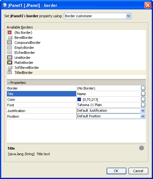 In the JPanel Border editor that appears, select the TitledBorder node in the Available Borders pane.