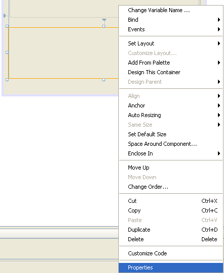 Because we want to visually distinguish the functions in the upper and lower sections of our GUI, we need to add a border and title to each JPanel. First we'll accomplish this using the Properties window and then we'll try it using the pop-up menu.