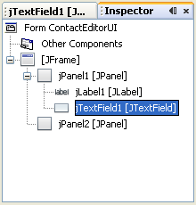 The JTextField snaps into position in the form aligned with the JLabel's baseline, as shown in the previous illustration. Notice that the JLabel shifted downward slightly in order to align with the taller text field's baseline. As usual, a node representing the component is added to the Inspector window.