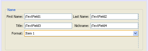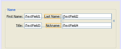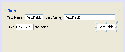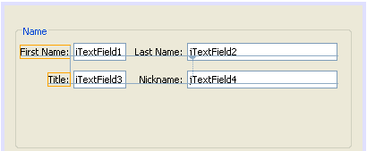 Whenever you add or move components that include text (JLabels, JTextFields, and so forth), the IDE suggests alignments which are based on the baselines of the text in the components. When we inserted the JTextField earlier, for example, its baseline was automatically aligned to the adjacent JLabels.