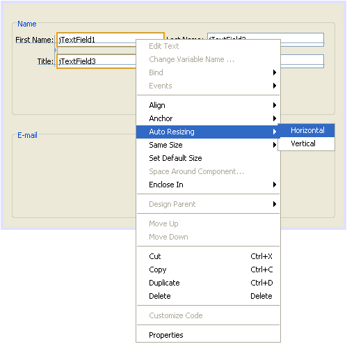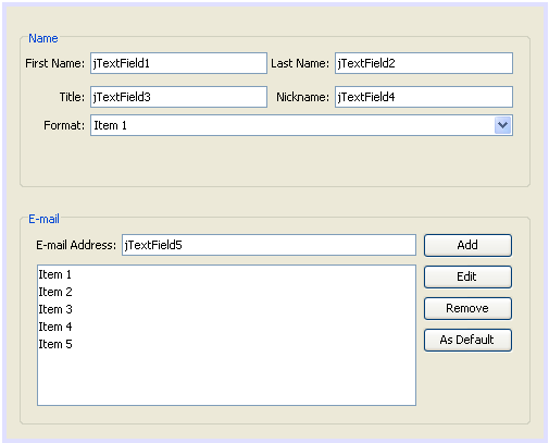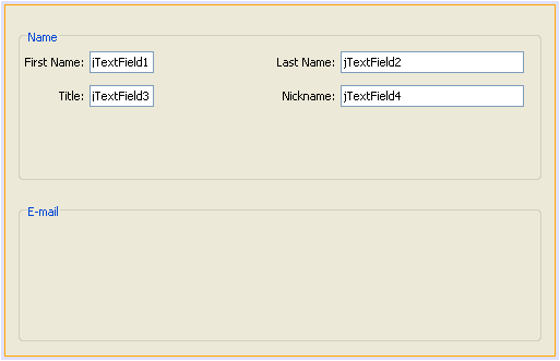 Select the bottom JPanel and repeat steps 2 through 5, but this time right-click the JPanel and access the Properties window using the pop-up menu. Enter E-mail for the Title property.