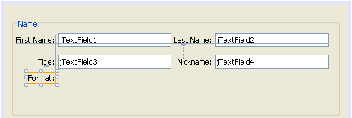 As in the previous examples, double-click the JLabel to select its display text and then enter Display Format: for the display name. Notice that when the JLabel snaps into position, the other components shift to accommodate the longer display text.
