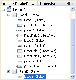The JLabels are added to the form creating a second row, as shown in the following illustration. Nodes representing each component are added to the Inspector window.