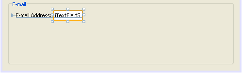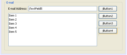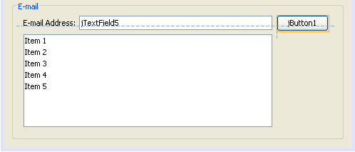 Move the JButton over the right edge of the E-mail Address JTextField in the lower JPanel. When the guidelines appear indicating that the JButton's baseline and right edge are aligned with that of the JTextField, shift-click to place the first button along the JFrame's right edge. The JTextField's width shrinks to accommodate the JButton when you release the mouse button.