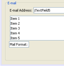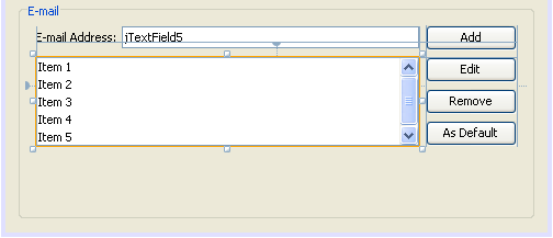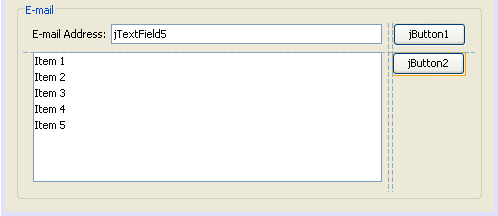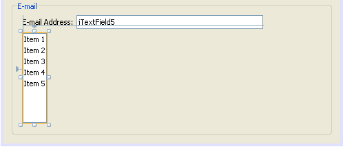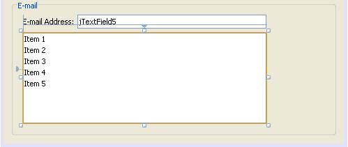 Move the cursor immediately below the E-mail Address JLabel we added earlier. When the guidelines appear indicating that the JList's top and left edges are aligned with the preferred margins along the JPanel's left edge and the JLabel above, click to position the JList.