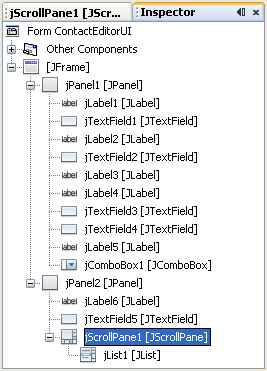 Since JLists are used to display long lists of data, they typically require the addition of a JScrollPane. Whenever you add a component which requires a JScrollPane, the GUI Builder automatically adds it for you. Because JScrollPanes are non-visual components, you have to use the Inspector window in order to view or edit any JScrollPanes that the GUI Builder created.