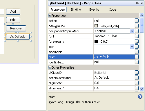 Select the JButton and then edit the text field in the Properties sheet or clicking the JButton once, pausing, and then clicking the JButton again. Enter Add for the top button, Edit for the second, Remove for the third, and As Default for the fourth.