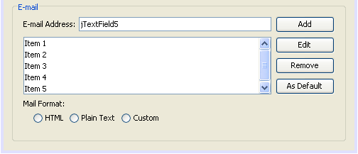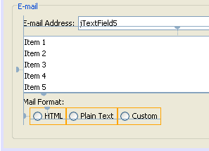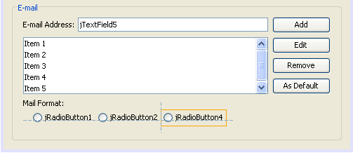 Three JRadioButtons are added to the form and indented below the Mail Format JLabel.