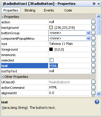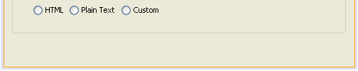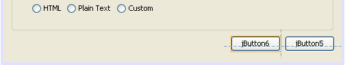 Select the JRadioButton and then edit the text field in the Properties sheet or clicking the JRadioButton once, pausing, and then clicking the JRadioButton again. Enter HTML for the left radio button, Plain Text for the second, and Custom for the third.