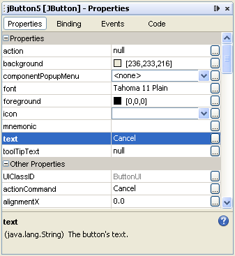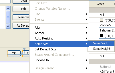 Select the JButton and then edit the text field in the Properties sheet or clicking the JButton once, pausing, and then clicking the JButton again. Enter OK for the left button and Cancel for right one. Notice that the width of the buttons changes to accommodate the new names.